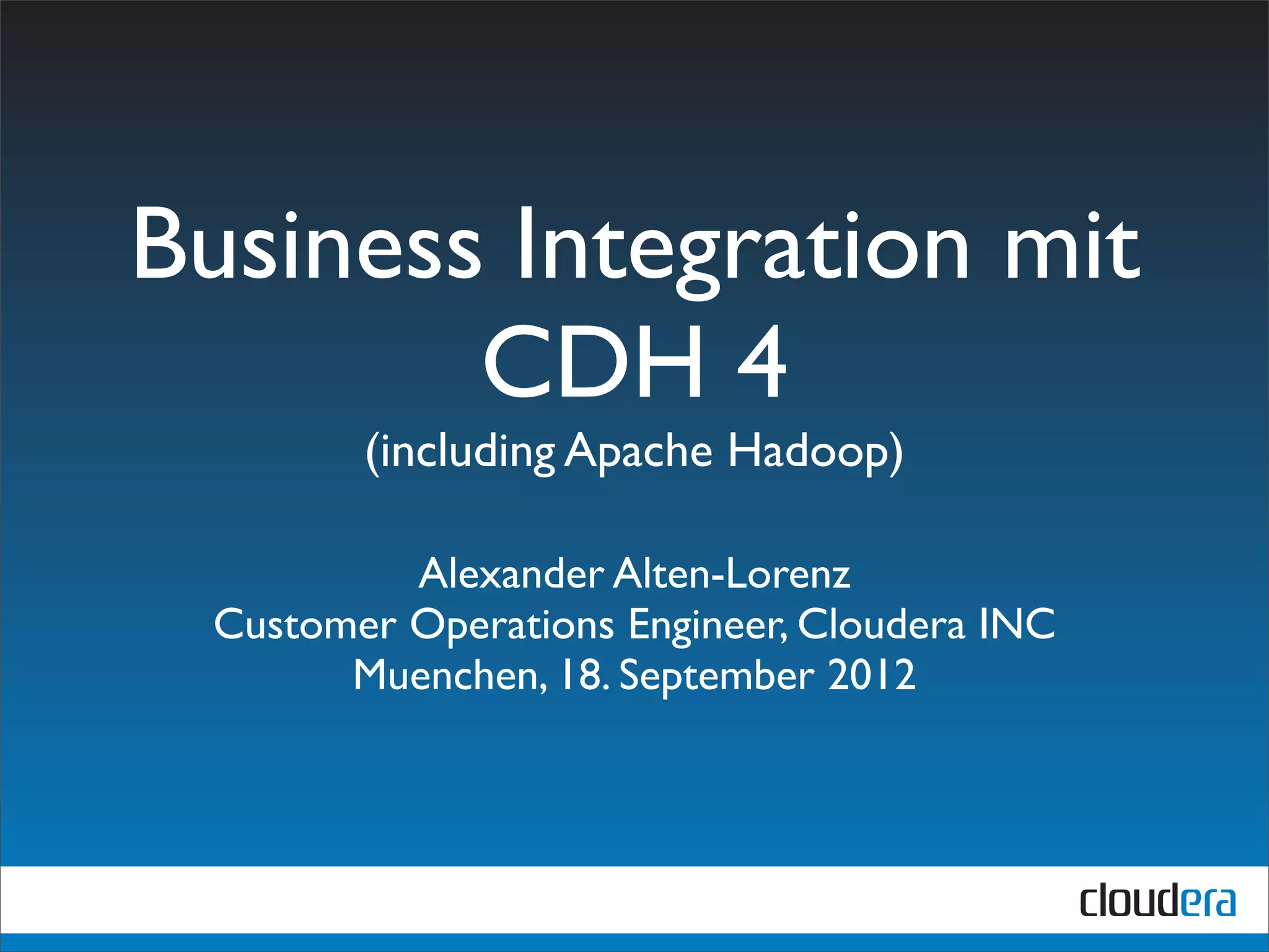 Das Dokument behandelt die Herausforderungen und Lösungen der Business-Integration mithilfe von CDH 4 und Apache Hadoop, insbesondere in den Bereichen Risiko-Management, Produktempfehlungen und Gefahrenerkennung. Es zeigt Anwendungsbeispiele und die Vorteile von Hadoop, einschließlich verteilter Datenverarbeitung und -speicherung. Des Weiteren werden Informationen zur Cloudera Inc. und deren Dienstleistungen bereitgestellt.