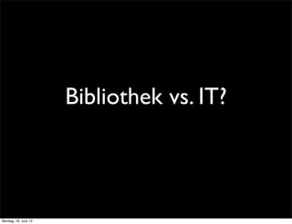 Das Dokument behandelt die Herausforderungen und Veränderungen in Bibliotheken und der IT, insbesondere im Hinblick auf die Notwendigkeit, sich an schnelle Innovationszyklen anzupassen. Es werden Prinzipien von 'Bibliothek 2.0' wie Interaktivität und offene Dienste vorgestellt und die Bedeutung von Offenheit sowie den Einsatz neuer Technologien und Formate hervorgehoben. Zudem wird die Zusammenarbeit zwischen Bibliothekaren und IT-Fachleuten als entscheidend für die Entwicklung besserer Dienstleistungen angesehen.