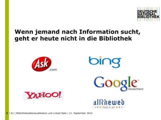 Das Dokument behandelt die Bedeutung von Bibliotheksdaten und Linked Data, um die Suche nach Informationen zu erleichtern und eine bessere Nutzung von Bibliotheksressourcen zu ermöglichen. Es erklärt, wie das Semantic Web und RDF (Resource Description Framework) als einfache Datenmodelle dienen können, um Informationen durch eindeutige Identifikatoren zu verknüpfen. Zudem wird auf die Notwendigkeit eingegangen, eine gemeinsame Sprache für den Datenaustausch zu etablieren, um eine effiziente und semantisch korrekte Informationsverknüpfung zu gewährleisten.