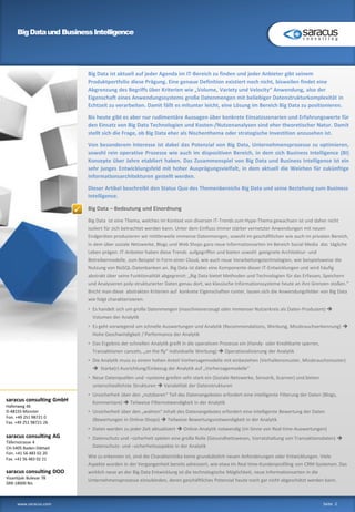 Das Dokument beschreibt die aktuellen Entwicklungen im Bereich Big Data und dessen Beziehung zur Business Intelligence, inklusive der Herausforderungen bei der Definition und dem Einsatz von Big Data-Technologien. Es hebt die Bedeutung der Verarbeitung großer Datenmengen in Echtzeit, die Notwendigkeit neuer Datenmanagement-Architekturen und die Chancen zur Optimierung von Unternehmensprozessen hervor. Zudem werden konkrete Anwendungsfelder und Technologien, einschließlich NoSQL-Datenbanken und Cloud-Infrastrukturen, thematisiert.