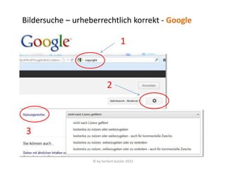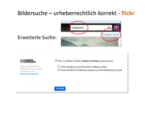 Das Dokument behandelt die urheberrechtlich korrekte Bildersuche und verweist auf Plattformen wie Google, Flickr und Wikimedia Commons. Es erklärt die Bedeutung von Creative-Commons-Lizenzen und gibt Hinweise zur Attribution, insbesondere bei Bildern, die keine schöpferische Höhe erreichen. Außerdem wird beschrieben, wie man Beschriftungen zu Bildern in Word-Dokumenten hinzufügt.
