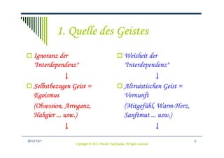 Das Dokument behandelt Konzepte wie interdependente Beziehungen, die dichotome Natur von egoistischem und altruistischem Denken sowie deren Auswirkungen auf das menschliche Verhalten. Es wird darauf hingewiesen, dass Vertrauen zu positiven sozialen Interaktionen beiträgt, während Misstrauen und Selbstbezogenheit negative emotionale Zustände fördern können. Zudem wird die Bedeutung eines ruhigen Geistes für die persönliche Gesundheit und das Wohlbefinden hervorgehoben.