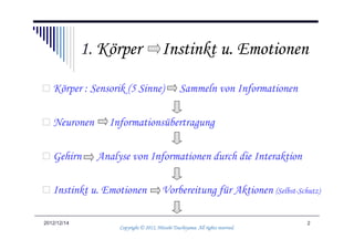 Das Dokument behandelt die Beziehung zwischen Körper, Instinkt, Emotionen und Bewusstsein sowie deren Einfluss auf menschliches Verhalten und Motivation. Es thematisiert die Dualität zwischen negativen und positiven Emotionen sowie die Rolle der Vernunft bei der Kontrolle von Emotionen und der Entscheidungsmotivation. Insgesamt wird die Entwicklung von Weisheit und altruistischer Haltung als wesentlich für das persönliche und soziale Glück dargestellt.