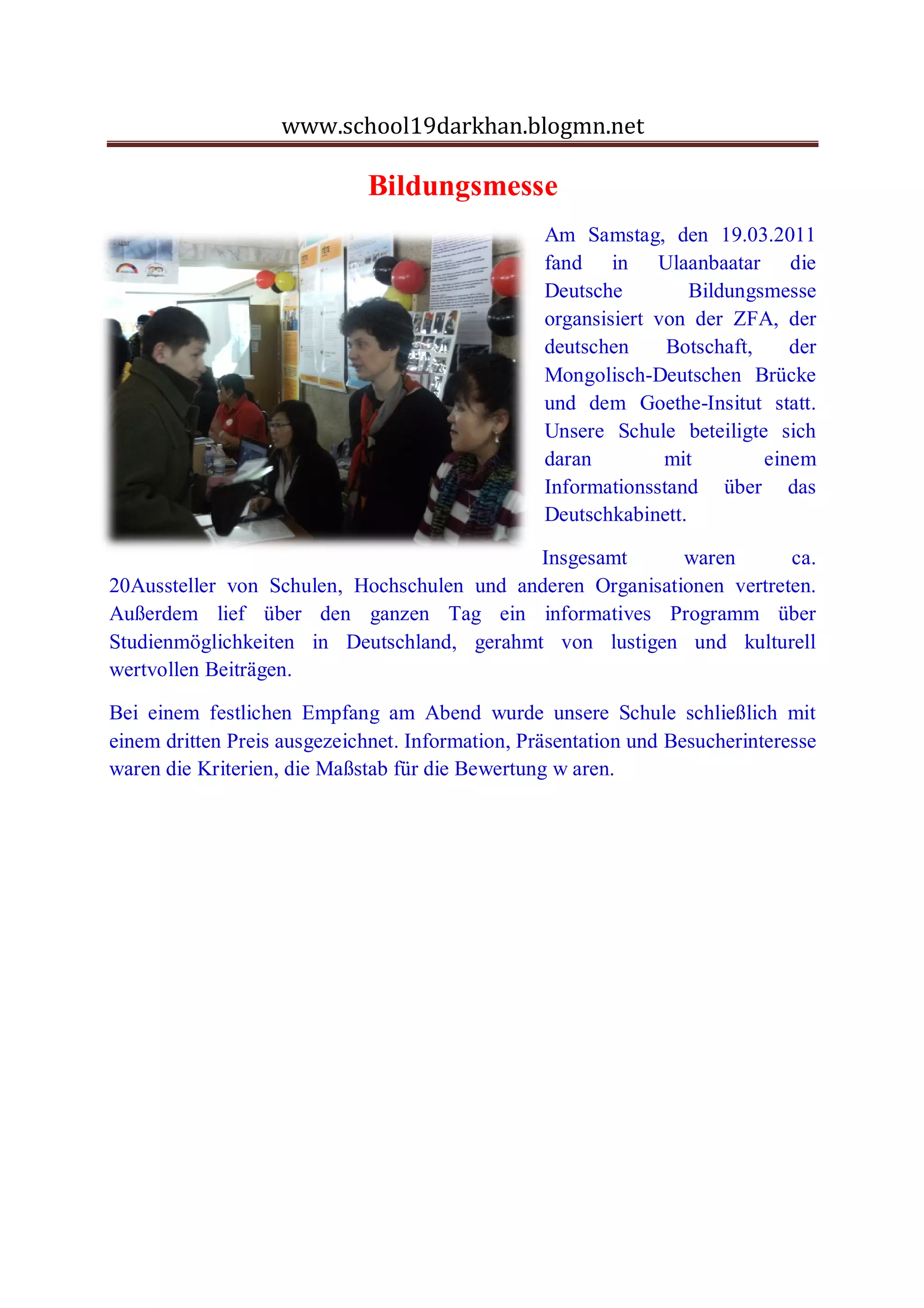 Am 19.03.2011 fand in Ulaanbaatar eine deutsche Bildungsmesse statt, organisiert von verschiedenen Institutionen, darunter die ZfA und das Goethe-Institut, an der auch unsere Schule teilnahm. Etwa 20 Aussteller präsentierten Informationen zu Studienmöglichkeiten in Deutschland, unterstützt von kulturellen Beiträgen. Unsere Schule wurde am Abend mit einem dritten Preis ausgezeichnet, basierend auf den Kriterien Information, Präsentation und Besucherinteresse.