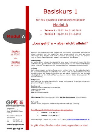 Die GPA-djp Salzburg bietet zwei Basiskurse für neu gewählte Betriebsratsmitglieder an, die vom 27. Februar bis 1. März 2017 und vom 2. bis 4. Oktober 2017 stattfinden. Diese Seminare zielen darauf ab, den Teilnehmern grundlegende Kenntnisse zur Betriebsratsarbeit und zu rechtlichen Fragestellungen zu vermitteln, um sie auf ihre verantwortungsvolle Rolle im Arbeitsleben vorzubereiten. Anmeldungen sind bis zu bestimmten Fristen möglich, und es werden spezielle Kurse angeboten, um auf individuelle Bedürfnisse einzugehen.