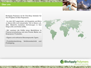 Bioapply Polymers ist ein Anbieter von Biokunststoffen, der 2011 gegründet wurde und Lösungen von der Ideenentwicklung bis zum finalen Produkt bietet. Das Unternehmen kombiniert Polymerverarbeitung mit innovativen Biopolymer-Produkten und unterstützt Kunden in der Entwicklung nachhaltiger, biologisch abbaubarer Lösungen für verschiedene Branchen. Der Fokus liegt auf der Schaffung maßgeschneiderter Produkte durch umfassende technische Unterstützung und Engineering-Dienstleistungen.