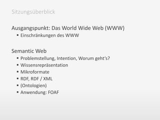 Das Dokument behandelt das Semantic Web und Mikroformate, insbesondere RDF und FOAF, zur Wissensrepräsentation im World Wide Web. Es beschreibt die Prinzipien hinter RDF, die Bedeutung von Tripeln (Subjekt, Prädikat, Objekt) und bietet praktische Anwendungen zur Beschreibung von Personen und deren Beziehungen. Weiterhin wird auf die Grenzen des WWW und die Herausforderungen bei der Interpretation natürlicher Sprache eingegangen.