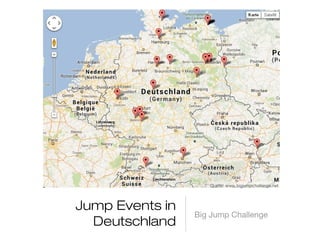 Die Big Jump Challenge 2013 umfasste Sprungevents in Deutschland und Europa, organisiert von einem Netzwerk aus Umwelt- und gemeinnützigen Organisationen. Ziel ist die Verbesserung des Gewässerschutzes und die Sensibilisierung für Wasserfragen, unterstützt durch Partner wie CISV und Viva con Agua. Zusätzlich können Interessierte den Newsletter abonnieren, um über zukünftige Aktivitäten informiert zu bleiben.