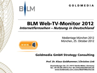 Die Studie von Goldmedia analysiert die Nutzung und den Markt für Web-TV in Deutschland, wobei 1.424 Web-TV-Angebote erfasst wurden. Der Markt wuchs zwischen 2010 und 2012 um rund sechs Prozent pro Jahr, mit einem Anstieg der Videoaufrufe um 17 Prozent im Jahr 2012. Insgesamt sind die meisten Inhalte Eigenproduktionen und die Zufriedenheit der Anbieter mit den Abrufzahlen ist rückläufig, trotz steigender Benutzerzahlen.