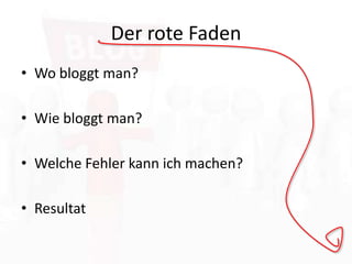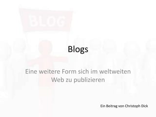 Der Beitrag von Christoph Dick erklärt die Möglichkeiten und Fehler beim Bloggen im Internet. Er hebt hervor, dass ein Blog eine kreative Plattform zum Schreiben darstellt, die einfach zu bedienen ist, und warnt vor typischen Fehlern wie dem Verbreiten falscher Informationen oder uninteressantem Inhalt. Abschließend wird der Erfindung des Blogs und der Möglichkeit, sich online zu präsentieren, Dank ausgesprochen.