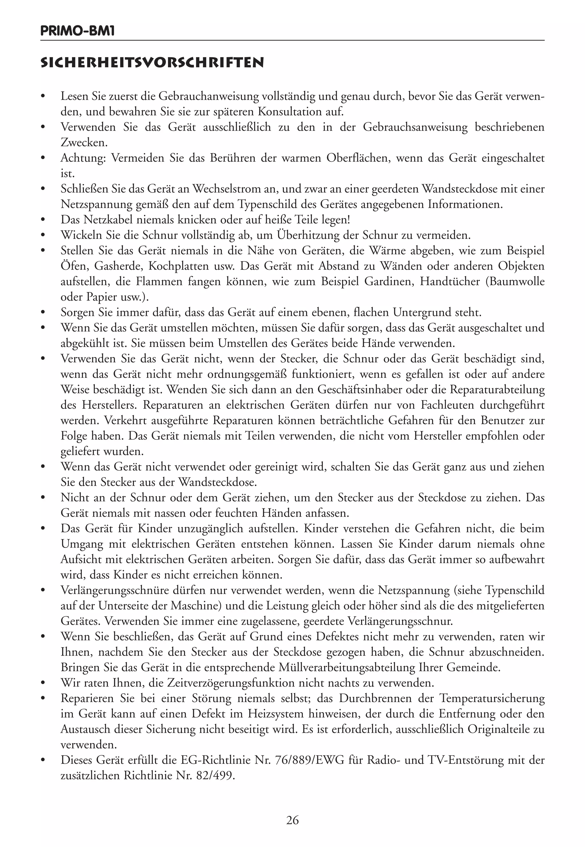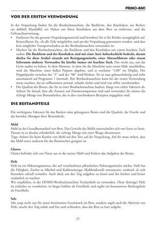 Das Dokument enthält Sicherheitsvorschriften und Gebrauchsanweisungen für die Brotbackmaschine primo-bm1. Es wird betont, dass die Gebrauchsanweisung vor der Benutzung vollständig gelesen werden sollte und dass das Gerät nur gemäß den Anweisungen verwendet werden darf, um Unfälle und Schäden zu vermeiden. Zusätzlich werden Tipps zur Zubereitung von Brot, bei der Verwendung der Maschine, und zur Reinigung gegeben.