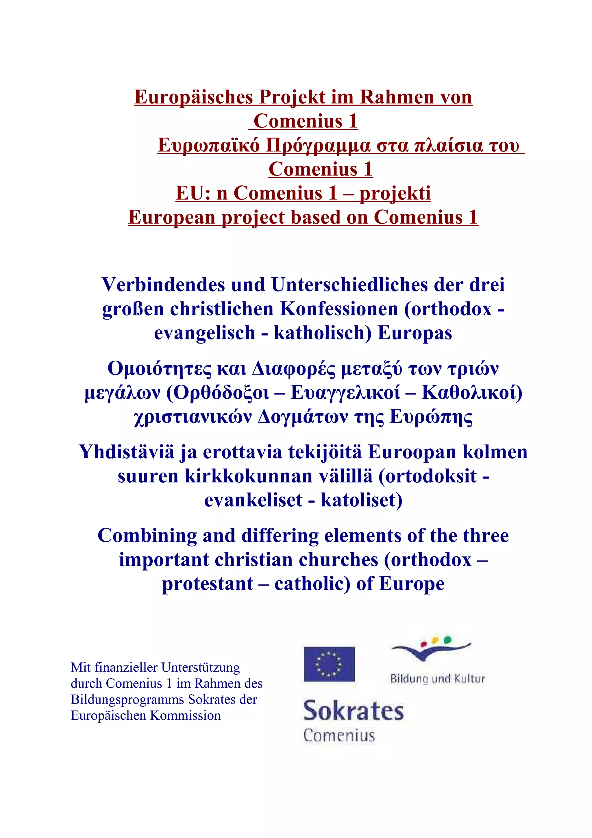 Das Dokument beschreibt ein europäisches Projekt im Rahmen von Comenius 1, das sich mit den Gemeinsamkeiten und Unterschieden der drei großen christlichen Konfessionen in Europa (orthodox, evangelisch, katholisch) beschäftigt. Es werden religiöse Feste und Bräuche dieser Konfessionen in verschiedenen Bildungseinrichtungen aufgeführt, sowie spezifische Feiertage und die damit verbundenen Traditionen. Der Fokus liegt auf der Darstellung der kulturellen und religiösen Praktiken, die in den genannten Schulen gepflegt werden.