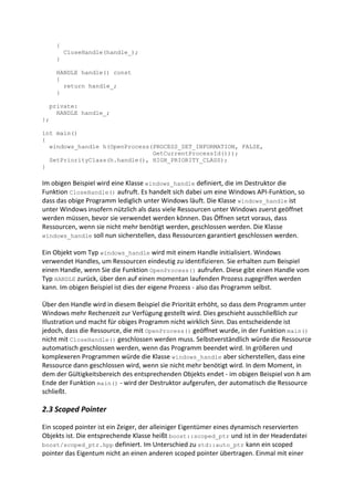 Das Dokument beschreibt die verschiedenen Arten von Smart Pointern in C++, insbesondere die von der Boost-Bibliothek bereitgestellten. Es erläutert die Funktionsweise von std::auto_ptr, boost::scoped_ptr, boost::scoped_array, boost::shared_ptr, boost::shared_array und boost::weak_ptr sowie deren Verwendung zum sicheren Umgang mit dynamischem Speicher und Ressourcen. Darüber hinaus wird das Konzept von RAII (Resource Acquisition Is Initialization) vorgestellt, das sicherstellt, dass Ressourcen effizient freigegeben werden, ohne dass der Programmierer sich um die Speicherverwaltung kümmern muss.