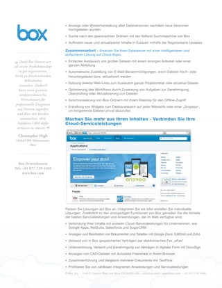 Box bietet eine Cloud-basierte Content-Management-Lösung, die Unternehmen ermöglicht, Inhalte sicher zu verwalten, auszutauschen und darauf zuzugreifen, unabhängig vom Standort der Mitarbeiter. Die Plattform vereinfacht die Zusammenarbeit durch Funktionen wie Benutzerverwaltung, Dateisynchronisierung und Integration mit anderen Cloud-Diensten und gewährleistet gleichzeitig höchste Sicherheitsstandards. Box wurde 2005 gegründet und unterstützt eine Vielzahl von Kunden durch eine benutzerfreundliche Schnittstelle und kontinuierliche Verbesserungen basierend auf Kundenfeedback.