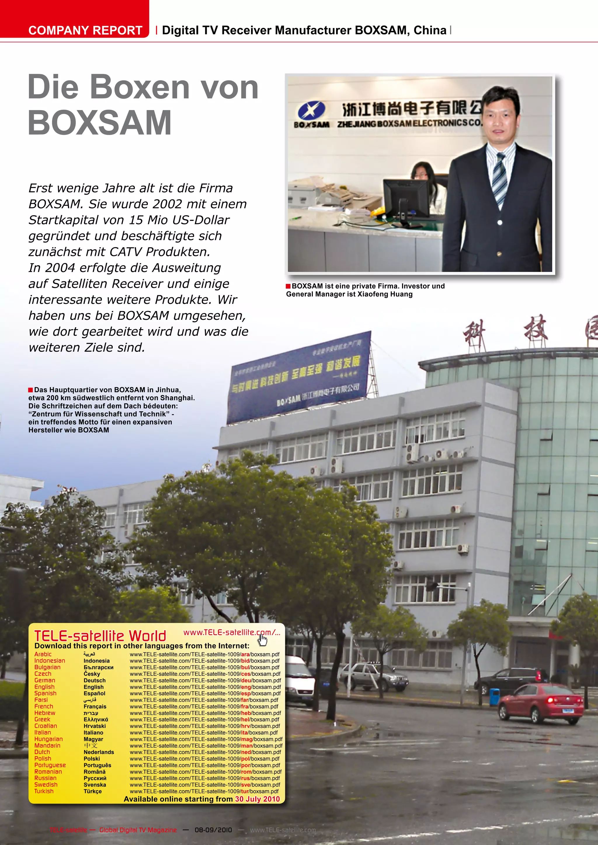Boxsam, 2002 in China gegründet, hat sich auf die Herstellung digitaler TV-Receiver spezialisiert und expandiert kontinuierlich, einschließlich der neuen Produktionshalle mit einer Fläche von 40.000 Quadratmetern, die bald eröffnet wird. Das Unternehmen exportiert seine Produkte in verschiedene Regionen, wobei es plant, bis 2010 unter eigenem Namen in Märkten wie Indien, dem mittleren Osten und Afrika aufzutreten. Boxsam produziert zudem eine Vielzahl von Geräten, darunter DVB-T, DVB-S und spezielle Radios, und strebt an, seine Produktion und Reichweite weiter zu erhöhen.