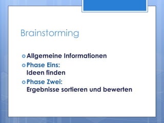 Das Dokument beschreibt das Verfahren des Brainstormings, das in zwei Phasen unterteilt ist: Ideenfindung und deren Bewertung. Die Technik fördert kreative Ideen durch ungefilterte Beiträge in einer Gruppenatmosphäre ohne Kritik. Brainstorming wird vor allem in der Werbung eingesetzt, ist jedoch auch für andere Problemlösungen geeignet, bietet Vorteile wie geringe Kosten, birgt jedoch auch Risiken wie Gruppendynamik und die Gefahr von Abschweifungen.