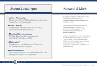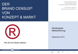 Der Brand Census® von Konzept & Markt bietet maßgeschneiderte Marktforschung zur Stärkung der Markenführung. Es umfasst die monetäre Bewertung von Marken, die Analyse von Markenstärke und imagebezogenen Treibern sowie Empfehlungen zur Optimierung der Marktposition. Unternehmen unterschiedlichster Branchen können von den datengestützten Erkenntnissen profitieren, um ihre Marken gezielt zu steuern und zu entwickeln.