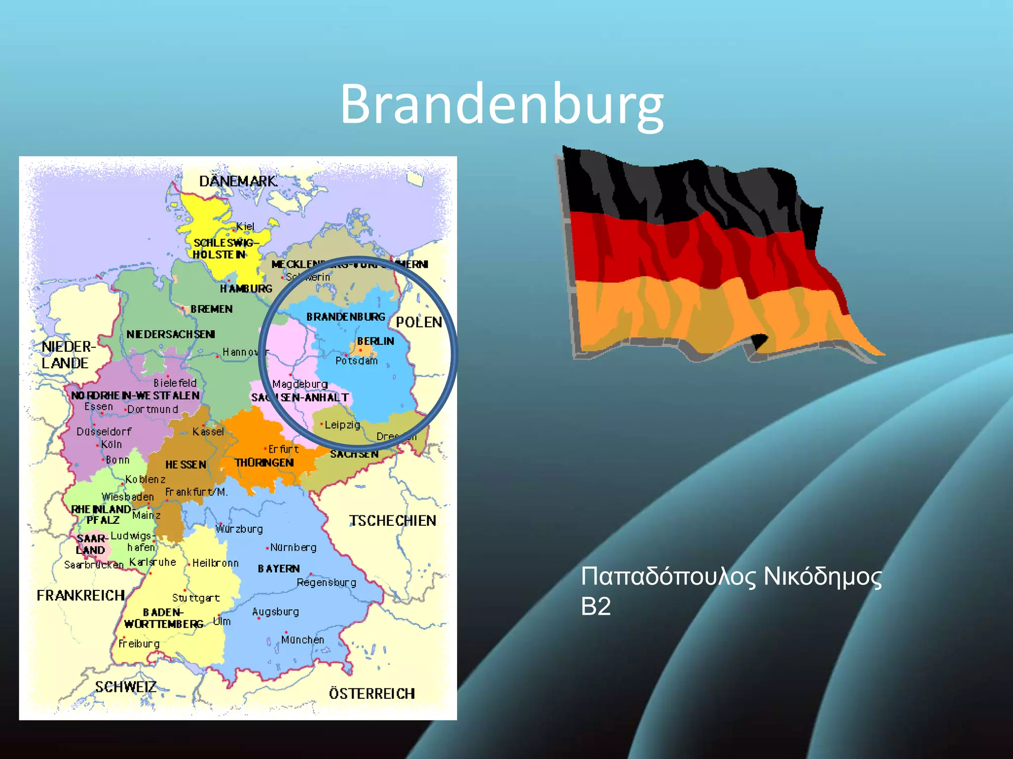 Brandenburg ist ein Bundesland im Nordosten Deutschlands mit einer Fläche von ca. 30.000 km² und etwa 2,6 Millionen Einwohnern. Die Hauptstadt Potsdam ist bekannt für das Schloss Sanssouci und seine Gärten, während Henri Theodor Fontane, ein berühmter Schriftsteller, in Neuruppin geboren wurde. Regionale Spezialitäten umfassen die Spreewälder Gurken und der Fürst-Pückler-Park.
