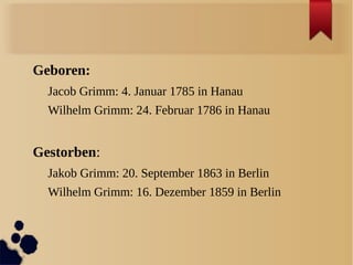 Die Brüder Grimm, Jacob und Wilhelm, wurden 1785 und 1786 in Hanau geboren und starben 1863 und 1859 in Berlin. Sie sind bekannt für ihre Märchensammlungen, darunter berühmte Geschichten wie 'Schneewittchen' und 'Rotkäppchen', sowie als Gründungsväter der Germanistik. Ihre Arbeit war politisch umstritten und zeigte oft brutale Inhalte, die in späteren Ausgaben für Kinder entschärft wurden.