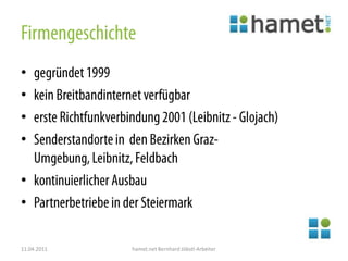 Hamet.net, gegründet 1999, bietet seit 2001 Breitbandinternet über moderne 5 GHz Richtfunktechnik in den Bezirken Graz-Umgebung, Leibnitz und Feldbach an. Das Netzwerk ermöglicht hohe Bandbreiten und eine stabile Versorgung ohne Festnetzanschluss, mit der Möglichkeit, mehrere Geräte gleichzeitig zu nutzen. Kunden profitieren von einem kundenorientierten Service und einfachen Inbetriebnahmen zu einmaligen Kosten von 90 Euro.