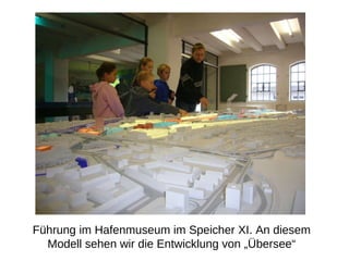 Das Dokument beschreibt eine Führung durch das Hafenmuseum im Speicher XI, bei der Historiker die Entwicklung des Warenverkehrs über das Wasser im letzten Jahrhundert untersuchen. Es wird auf die Bedeutung von Flaschenzügen und die Nutzung von Archiven und alten Dokumenten hingewiesen, wobei auch eine alte Flaschenpost zur Sprache kommt. Zudem erzählt ein echter Seemann interessante Geschichten über das Leben zur See.