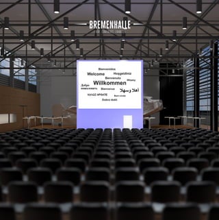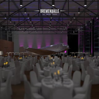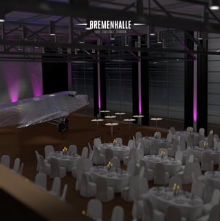 Die Bremenhalle ist eine vielseitige Event-Location mit über 800 m2 Innenbereich und mehr als 1200 m2 Außenbereich, die eine Kombination aus modernem urbanem Ambiente und nostalgischem Flair bietet. Die Halle verfügt über verschiedene Bestuhlungs- und Beleuchtungsoptionen, technisches Equipment und umfassenden Eventservice, einschließlich Catering und Personalverwaltung. Sie liegt günstig auf dem Dach des Terminals 3 am City Airport Bremen und ist leicht erreichbar von der Innenstadt.