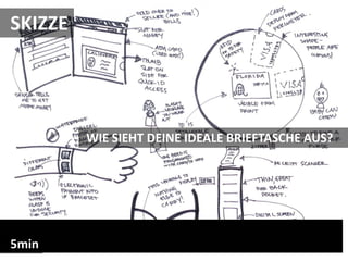 Das Dokument beschreibt einen Design-Thinking-Prozess zur Entwicklung einer idealen Brieftasche, bei dem Nutzerinterviews und Sketching-Übungen verwendet werden, um Bedürfnisse und Ideen zu sammeln. Es enthält Schritte zur Definition des Nutzers, zur Ideenfindung und zum Erstellen von Prototypen sowie zur Reflexion über den gesamten Prozess. Abschließend werden Fragen zur Rückmeldung und zur weiteren Entwicklung des Designs gestellt.