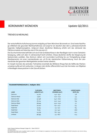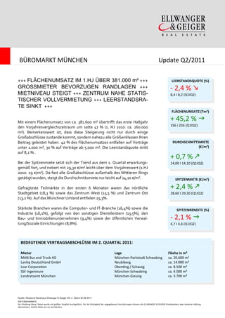 Der Büroimmobilienmarkt in München zeigt im ersten Halbjahr 2011 einen Flächenumsatz von über 381.000 m², was einem Anstieg von 47 % im Vergleich zum Vorjahr entspricht, während die Leerstandsquote auf 8,2 % sinkt. Die durchschnittliche Mietpreisentwicklung verläuft mit leichten Steigerungen in den Randlagen und einer gefragten Spitzenmiete von 29,30 €/m² positiv. Der wirtschaftliche Aufschwung zeigt sich in einer breiten Nachfrage und es wird ein Jahresziel von rund 650.000 m² bis 700.000 m² für den Flächenumsatz angepeilt.