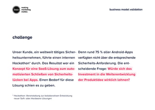 Das Dokument beschreibt die Evaluierung der Marktfähigkeit einer digitalen Sicherheitslösung durch ein internationales Sicherheitsunternehmen, das in einem Hackathon ein Konzept für eine SaaS-Lösung entwickelte. Durch qualitative Interviews mit Anwendern aus der App- und Game-Entwicklung wurde die Marktakzeptanz und die funktionalen Anforderungen ermittelt, was zu einer validierten Empfehlung für ein marktgerechtes Produkt führte. Die systematische Validierung des Geschäftsmodells verhinderte eine potenzielle Fehlinvestition und betonte die Bedeutung einer marktorientierten Entwicklung neuer Produkte.