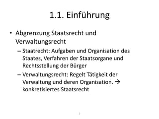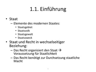 Das Dokument behandelt die grundlegenden Elemente des modernen Staates, einschließlich Staatsgebiet, Staatsvolk und Staatsgewalt, und diskutiert die Beziehung zwischen Recht und Staat. Es wird zwischen Staatsrecht und Verwaltungsrecht sowie zwischen öffentlichem Recht und Privatrecht unterschieden, wobei verschiedene Theorien zur Klassifizierung von Normen vorgestellt werden. Zudem wird das Partnerschaftsgesetz in der Schweiz thematisiert, wobei Artikel des Gesetzes sowohl öffentlich-rechtliche als auch privatrechtliche Elemente enthalten.