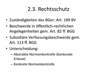 Das Dokument behandelt die Zuständigkeiten des Bundesgerichts (BGer) im Bereich des Rechtsschutzes nach Artikel 189 BV und den relevanten Bestimmungen des BGG. Es unterscheidet zwischen der Beschwerde in öffentlich-rechtlichen Angelegenheiten, der subsidiären Verfassungsbeschwerde sowie der abstrakten und konkreten Normenkontrolle. Diese Aspekte sind bedeutend für die rechtlichen Verfahren in der Schweiz.