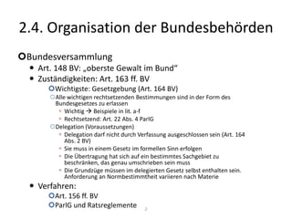 Das Dokument beschreibt die Organisation der Bundesbehörden in der Schweiz, einschließlich der Bundesversammlung, des Bundesrates und des Bundesgerichts, sowie deren wesentlichen Funktionen und Verfahren nach der Bundesverfassung. Es wird hervorgehoben, dass wichtige rechtsetzende Bestimmungen als Bundesgesetz erlassen werden müssen und dass bestimmte Erlassformen wie einfache Bundesbeschlüsse nicht rechtsetzend sind. Es werden auch Prüfungsfragen zu spezifischen Gesetzen und deren rechtlicher Grundlage angeregt.