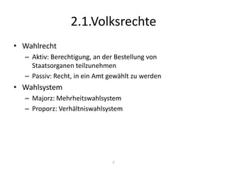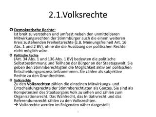 Das Dokument behandelt die politischen und Volksrechte in der Schweiz, einschließlich der Aktivitäten und Rechte der Bürger zur Mitwirkung an der politischen Entscheidungsfindung, wie Wahlrechte, Initiativen und Referenden. Es erörtert auch die Bedingungen für Verfassungsrevisionen sowie die Anforderungen an die Einheit von Materie und Form von Initiativen und betont die Beachtung des Völkerrechts, insbesondere das Non-Refoulement-Prinzip. Anhand der Volksinitiative zur Ausschaffung krimineller Ausländer werden die verfassungsmäßigen Voraussetzungen und deren Erfüllung untersucht.