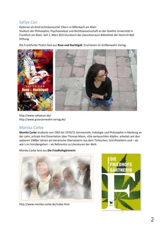 Das Dokument enthält Informationen über mehrere Autoren, die beim Buchgassenfest in Frankfurt lesen werden, darunter Safiye Can, Monika Carbe, Barbara Höhfeld, Claus-Peter Leonhardt, Jannis Plastargias, Sylvia Schopf und Barbara Zeizinger. Jede Autorin und jeder Autor wird kurz vorgestellt, einschließlich ihres Werdegangs und ihrer veröffentlichten Werke. Weitere Details können über Webseiten und Kontaktinformationen abgerufen werden.