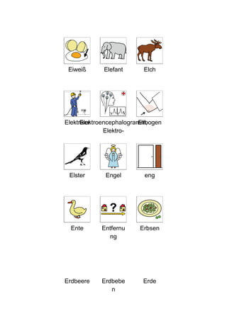Das Dokument enthält eine Auflistung von Wörtern, die mit dem Buchstaben 'e' beginnen. Es umfasst verschiedene Themen, darunter Tiere, Gegenstände und Wetterbedingungen. Zudem werden einige Tätigkeiten und Konzepte angedeutet, was auf eine kreative oder spielerische Herangehensweise hinweist.