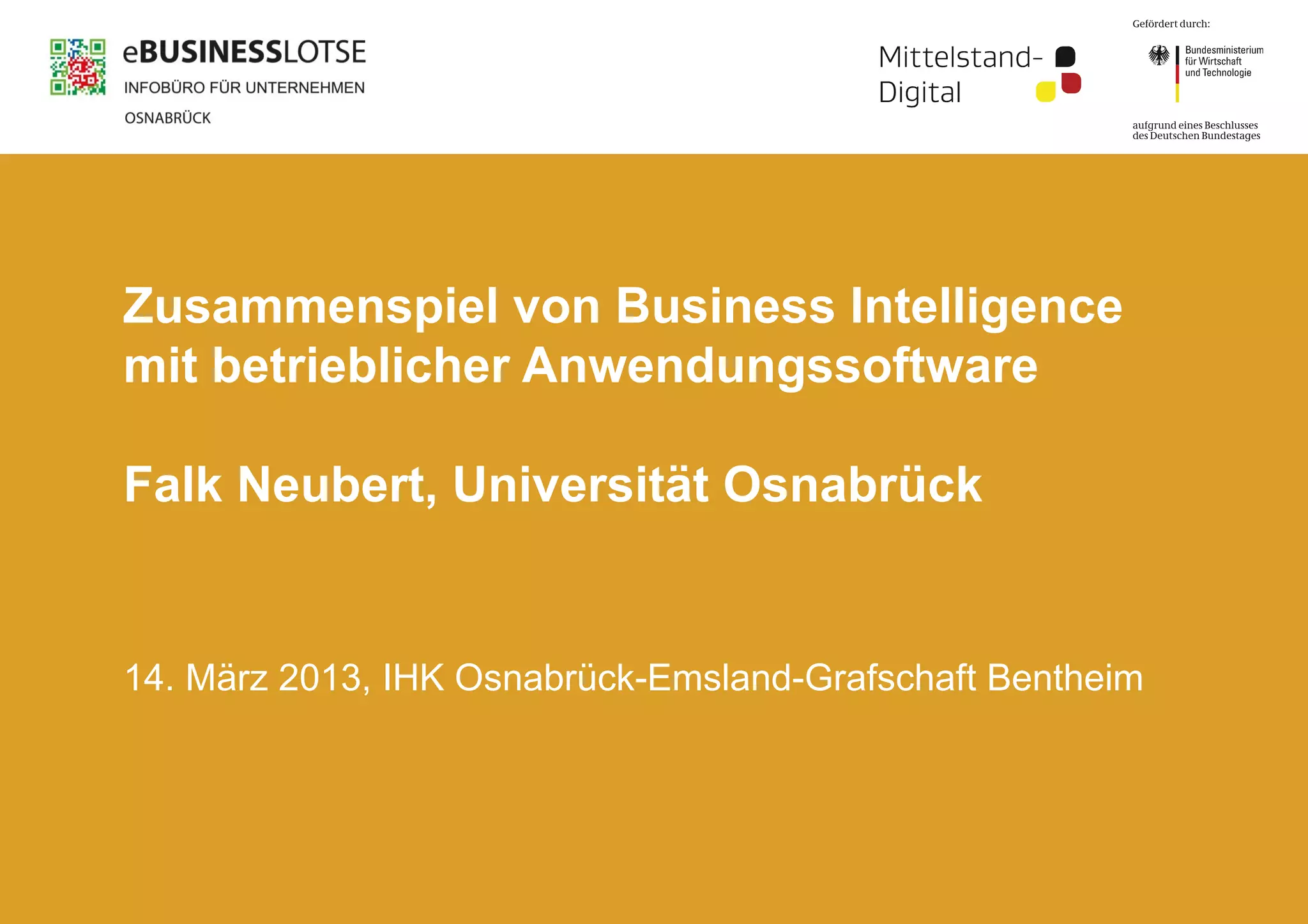 Das Dokument beschreibt die Integration von Business Intelligence (BI) in betriebliche Anwendungssoftware, wobei der Fokus auf den Prozessen der Datenbereitstellung, Informationsgenerierung und -distribution liegt. Es behandelt ETL-Prozesse sowie OLAP-Methoden zur Analyse von Daten und hebt die Wichtigkeit konsistenter und validierter Daten für BI-Anwendungen hervor. Zudem werden Unterstützungsangebote für kleine und mittlere Unternehmen bei der Einführung von BI-Lösungen erörtert.