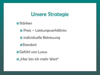 Die Strategie des Unternehmens basiert auf Stärken wie Preis-Leistungs-Verhältnis, individueller Betreuung und einem Standort, der ein Gefühl von Luxus vermittelt. Die Umsatz- und Finanzierungskosten setzen sich aus verschiedenen Faktoren wie Produktpreisen, Miete, Personalkosten und anderen finanziellen Belastungen zusammen. Der Break-even-Point wird in Bezug auf diese Kostenstrukturen betrachtet.