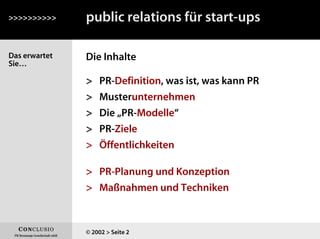 Das Dokument behandelt die Grundlagen und Strategien der Public Relations (PR) für Start-ups, einschließlich Definitionen, PR-Modelle, Ziele und Maßnahmen. Es betont die Bedeutung eines strukturierten PR-Managements und die Verantwortung des Managements bei der Kommunikation mit verschiedenen Öffentlichkeiten. Zudem werden verschiedene Techniken wie Medienarbeit, Sponsoring und Events vorgestellt, um die Sichtbarkeit und das Image eines Unternehmens zu fördern.