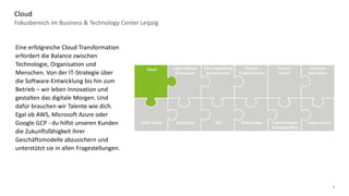 Das Dokument beschreibt die verschiedenen Fokusbereiche und Dienstleistungen des Business & Technology Centers Leipzig, das Unternehmen in den Bereichen Cloud, Datenengineering, Cyber Defense, Finanztransformation, Human Capital und mehr unterstützt. Es betont die Notwendigkeit der Balance zwischen Technologie, Organisation und Menschen und bietet Lösungen zur digitalen Transformation, zur Verbesserung von IT-Systemen und zur Implementierung moderner HR-Strategien. Außerdem wird auf die Unterstützung bei großen Transformationsprojekten und die Zusammenarbeit mit nationalen und internationalen Kunden eingegangen.