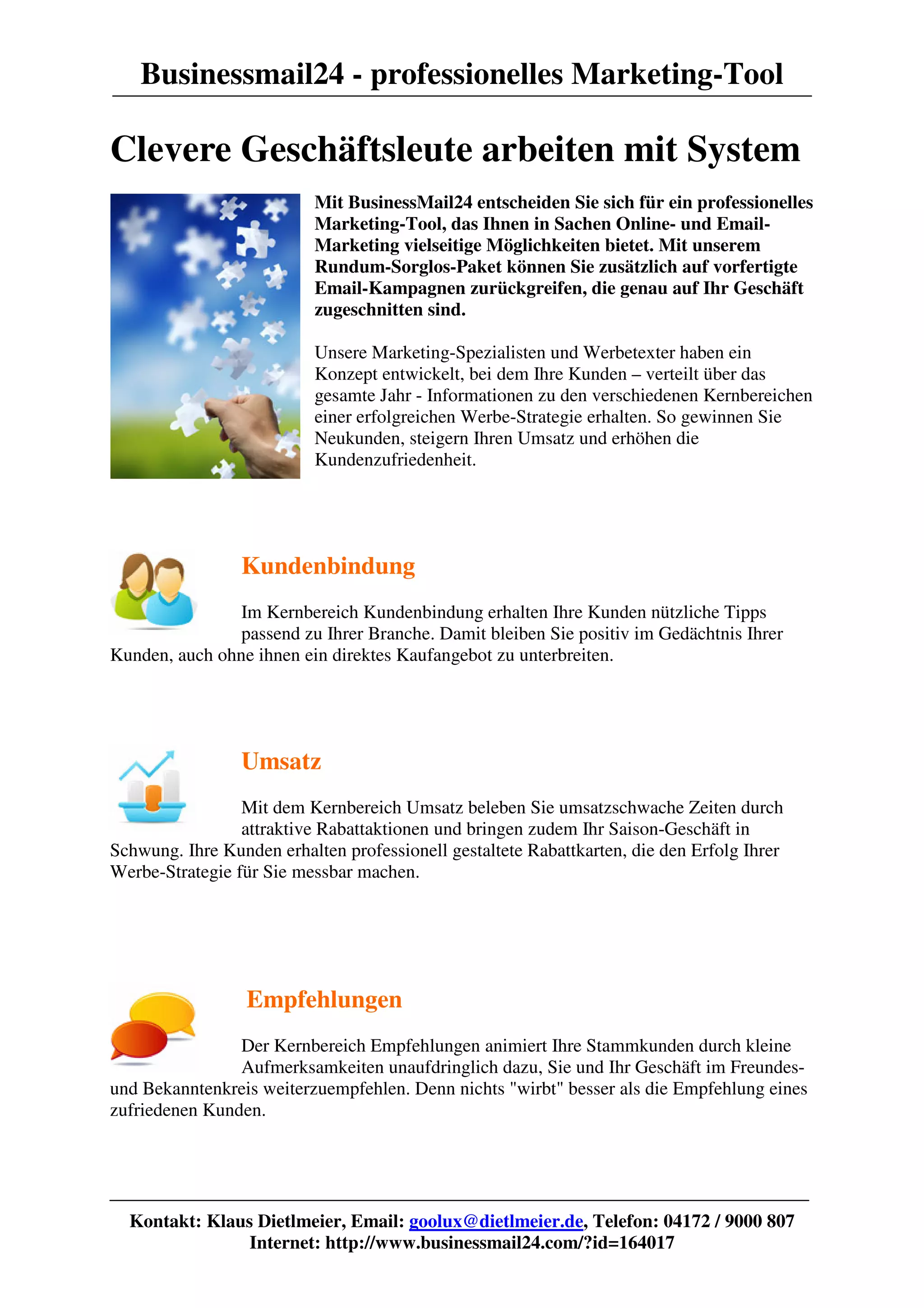 businessmail24 ist ein professionelles Marketing-Tool, das umfassende Möglichkeiten für Online- und E-Mail-Marketing bietet, einschließlich vorgefertigter Kampagnen, um Neukunden zu gewinnen und den Umsatz zu steigern. Kundenbindung wird durch nützliche Tipps und saisonale Rabattaktionen gefördert, während ein integriertes CRM-System die Verwaltung von Kontaktdaten erleichtert. Das Tool ermöglicht auch die Erstellung eigener Webseiten und bietet ein benutzerfreundliches Interface sowie rechtliche Konformität.