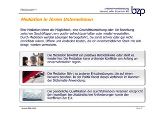Die Unternehmensberatung MediationBzP bietet Mediation als Möglichkeit zur Lösung von Konflikten zwischen Geschäftspartnern und zur Wahrung eines positiven Betriebsklimas an. Der Mediator arbeitet an einem Interessenausgleich und formuliert verbindliche Vereinbarungen, die bei Bedarf juristisch relevant sein können. Das Vorgehen umfasst definierte Schritte, von der Auftragsklärung über Mediation bis zur Abschlussbesprechung, um Lösungen zu erreichen, die sonst schwer erreichbar wären.