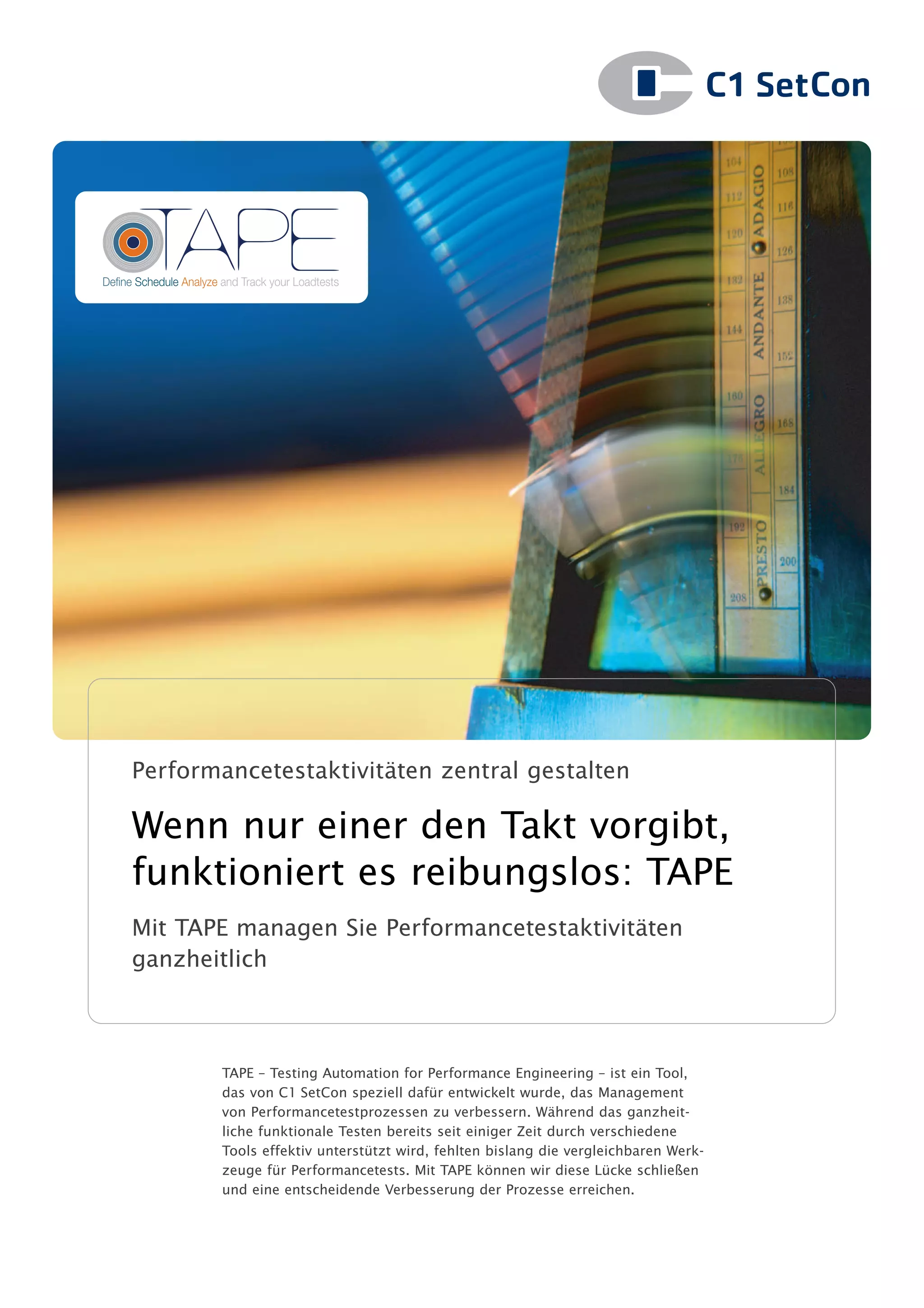 Das Dokument beschreibt tape, ein Tool zur ganzheitlichen Verwaltung von Performance-Testaktivitäten, das von c1 setcon entwickelt wurde, um die Prozesse im Performance Engineering zu verbessern. Mit tape können Key Performance Indicators definiert, Testläufe zentral geplant und Ergebnisse automatisiert ausgewertet werden, um die Effizienz und Qualität von Last- und Performance-Tests zu steigern. Außerdem ermöglicht tape eine umfassende Integration verschiedener Testwerkzeuge und unterstützt die kontinuierliche Verbesserung der Testprozesse durch automatisches Lernen aus durchgeführten Tests.