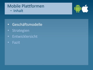 Das Dokument behandelt mobile Plattformen, insbesondere Geschäftsmodelle und Strategien von Apple und Google. Apple verfolgt ein geschlossenes System zur Benutzerbindung, während Google eine offene Plattform zur Verbreitung von Android schafft. Die Perspektive von Entwicklern wird ebenfalls betrachtet, wobei Unterschiede in der Fragmentierung und den Einschränkungen der Betriebssysteme thematisiert werden.