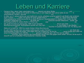 Cameron Diaz, geboren am 30. August 1972 in San Diego, ist eine US-amerikanische Schauspielerin und ehemalige Model, die mit 21 Jahren in der Hauptrolle von 'Die Maske' bekannt wurde. Ihr Durchbruch kam 1998 mit 'Verrückt nach Mary', gefolgt von Erfolgen in Independentfilmen und Komödien, wobei sie häufig für ihre schauspielerischen Leistungen nominiert wurde. Heute gehört sie zu den bestverdienenden Schauspielerinnen Hollywoods und hat in ihrer Karriere zahlreiche bedeutende Rollen gespielt.