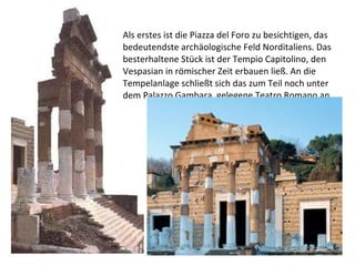 Der Rundgang durch Brescia umfasst bedeutende Sehenswürdigkeiten wie die Piazza del Foro mit dem gut erhaltenen Tempio Capitolino und das römische Museum, in dem die geflügelte Siegesgöttin zu finden ist. Weitere Highlights sind der alte und neue Dom an der Piazza Paolo VI sowie die Piazza della Loggia mit ihrem beeindruckenden Renaissance-Gebäude und der mechanischen Uhr. Zudem ist das Kastell auf dem Cidneo-Hügel mit einem Waffenmuseum und dem Museo del Risorgimento ein wichtiger Teil der Stadtgeschichte, die Brescia den Titel 'Leonessa d'Italia' verliehen hat.
