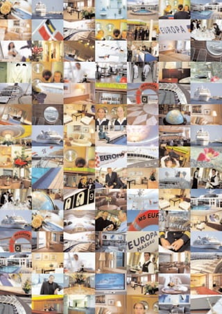 Das Dokument beschreibt das Hapag-Lloyd Kreuzfahrtschiff MS Europa, das als das beste Kreuzfahrtschiff der Welt gilt und für seinen luxuriösen Service, erstklassige Küche und ansprechendes Design bekannt ist. Es wird auch ein exklusives Interview mit dem Architekten Wilfried Köhnemann präsentiert, der die Innenräume entworfen hat, sowie eine Beschreibung des Side Hotels in Hamburg, das als Beispiel für modernes, sensorisches Design dient. Insgesamt thematisiert das Magazin die Verbindung von Luxus, Kunst und Architektur in der Kreuzfahrt- und Hotelbranche.
