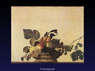 Das Dokument listet verschiedene Werke von Caravaggio auf, darunter 'Früchtekorb', 'Der siegreiche Amor', 'Die ungläubige Thomas', 'Judith und Holofernes' sowie 'Jesus Grablegung'. Diese Kunstwerke thematisieren sowohl weltliche als auch biblische Motive. Caravaggios Stil zeichnet sich durch starke Hell-Dunkel-Kontraste und realistische Darstellungen aus.
