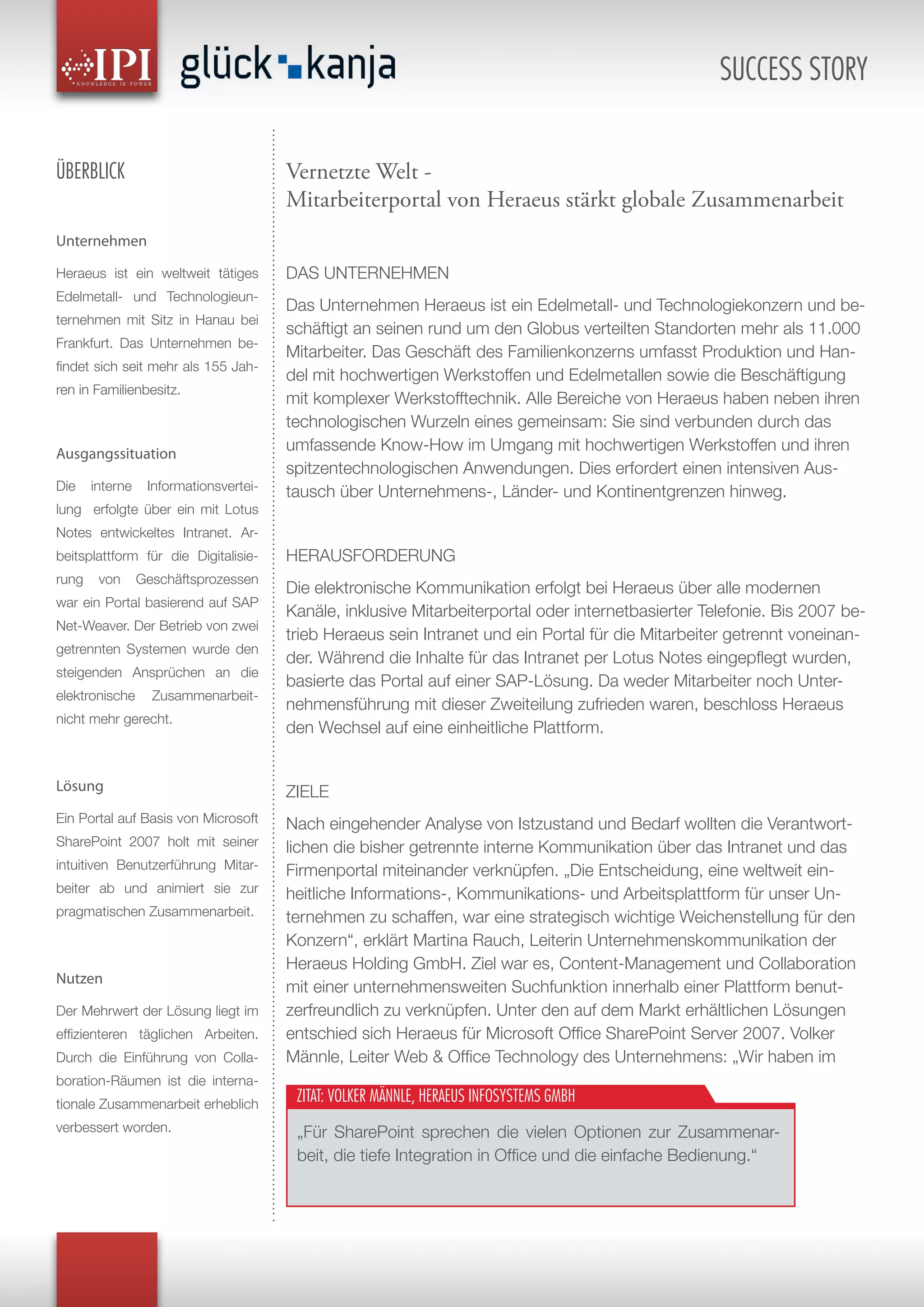 Die Heraeus Holding GmbH, ein weltweit tätiger Edelmetall- und Technologiekonzern mit über 11.000 Mitarbeitern, hat beschlossen, seine interne Kommunikation auf eine einheitliche Plattform zu migrieren, um die Zusammenarbeit zu verbessern und den gestiegenen Anforderungen an die elektronische Kommunikation gerecht zu werden. Nach der Evaluation verschiedener Lösungen wurde entschieden, Microsoft Office SharePoint Server 2007 zu implementieren, was zu einer signifikanten Verbesserung der internationalen Zusammenarbeit und der Benutzerfreundlichkeit geführt hat. Die Einführung des neuen Portals wurde von den Nutzern positiv aufgenommen und unterstützt mittlerweile über 6000 Anwender weltweit.