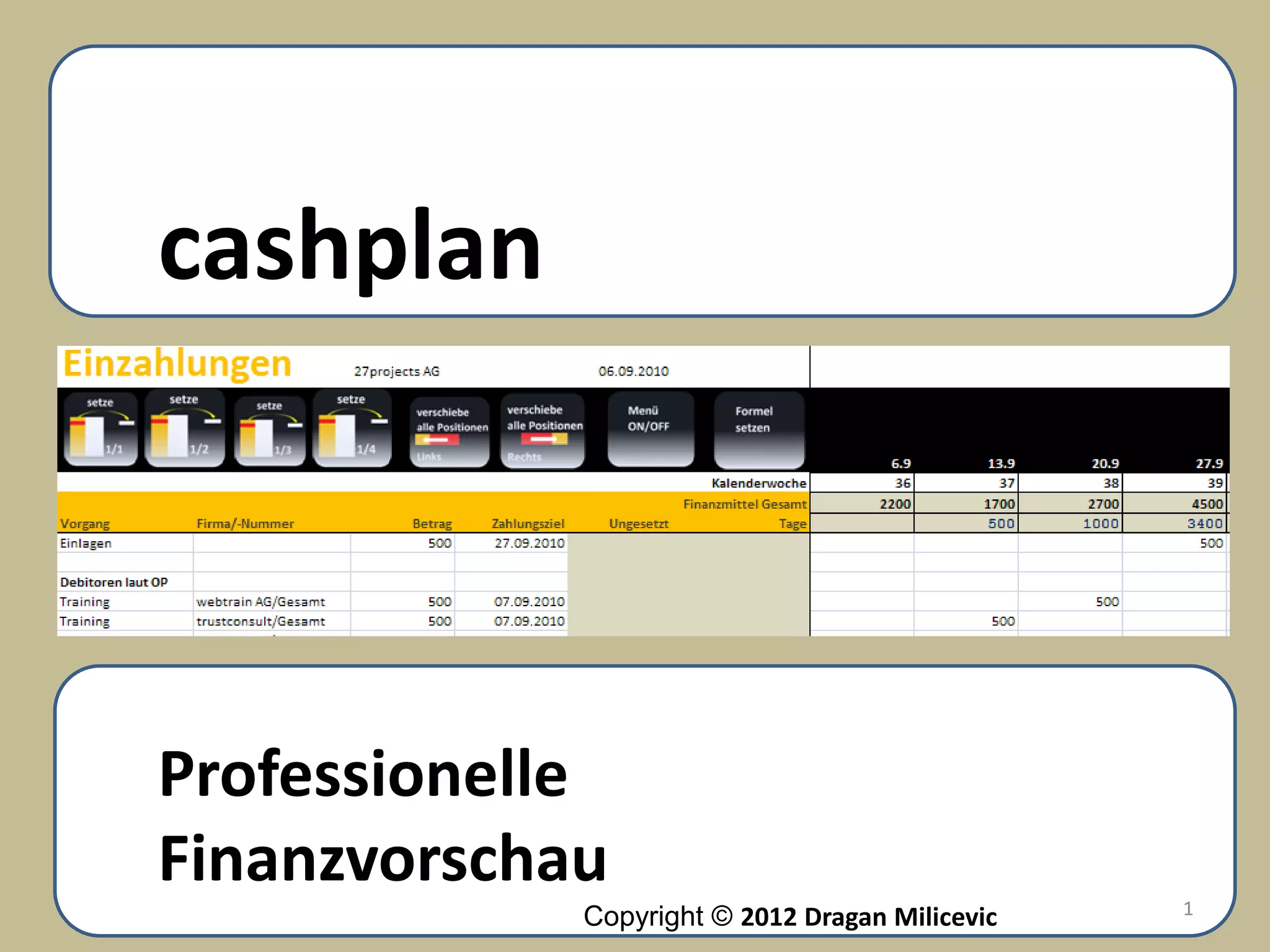 Das Dokument beschreibt die Nutzung einer Excel-Vorlage namens Cashplus zur rollierenden Finanzplanung, die verschiedene Sichten für Eingaben zu Banken, Auszahlungen und Einzahlungen bietet. Es erklärt, wie man finanzielle Vorgänge auf einer Zeitachse erfasst und deren Auswirkungen auf den Geldbestand visualisiert, wobei Formeln zum Schutz der Integrität verwendet werden. Nutzer können durch einfache Eingaben und Positionierungen die Finanzen überwachen und steuern, während verschiedene Schritte und Funktionen dokumentiert sind.