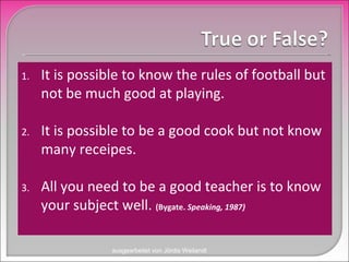 Das Dokument von Jördis Weilandt befasst sich mit der Förderung der Sprechkompetenz im Sprachunterricht und betont die Bedeutung von hoher Sprechmotivation und ausgeglichener Beteiligung der Lernenden. Es wird darauf hingewiesen, dass eine ausgewogene Ratio von bekanntem und neuem Wissen notwendig ist, um Raum für Interaktion und Kooperation zu schaffen. Zitate und Verweise auf verschiedene Autoren untermauern die Argumentation für effektives Lehren durch praktische Beispiele.